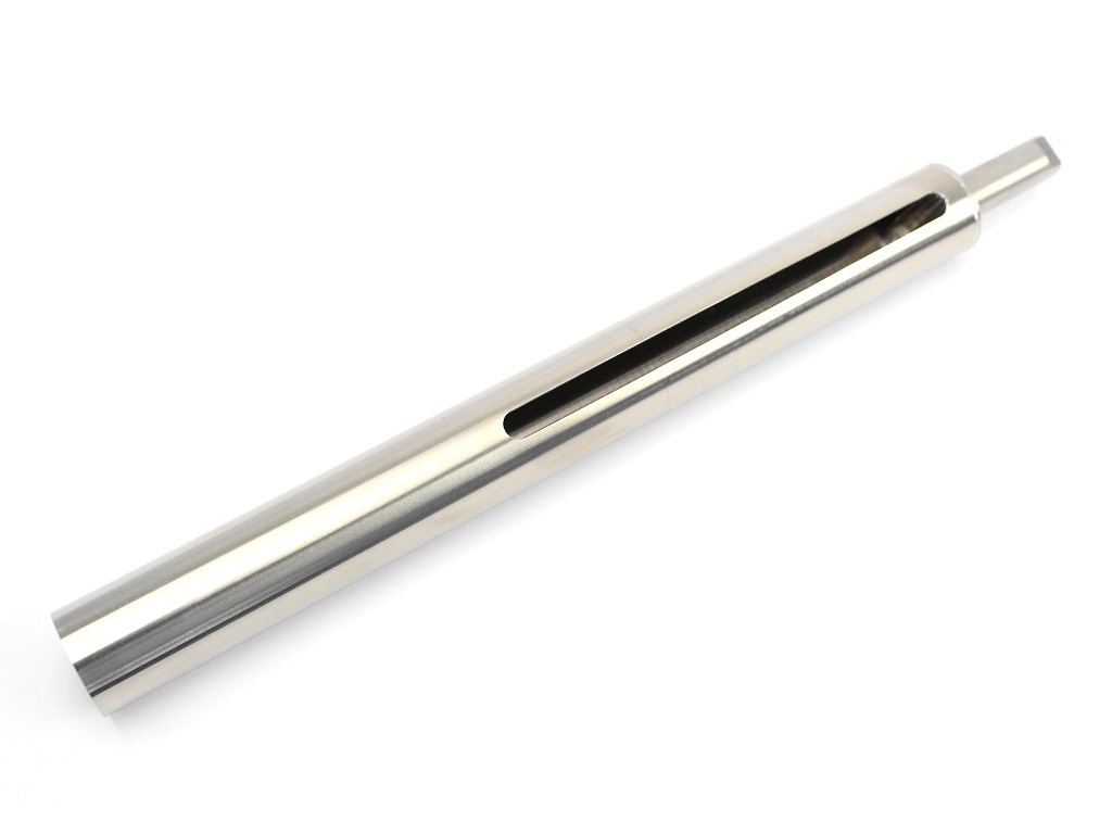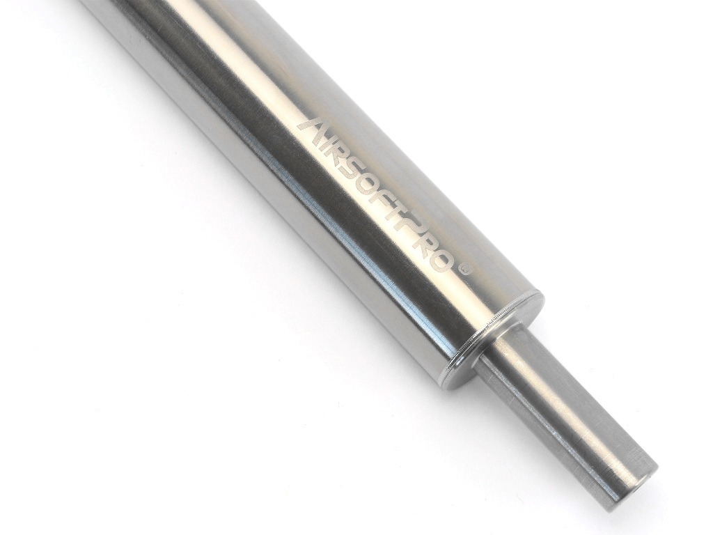 The inside diameter of the cylinder is 22 mm and is therefore smaller than an aluminum cylinder. Make sure that your piston is suitable for this stainless steel cylinder. We have tested that the AirsoftPro, Well and CYMA pistons fit. But Marui, JG, Maple Leaf, Laylax pistons cannot be inserted.